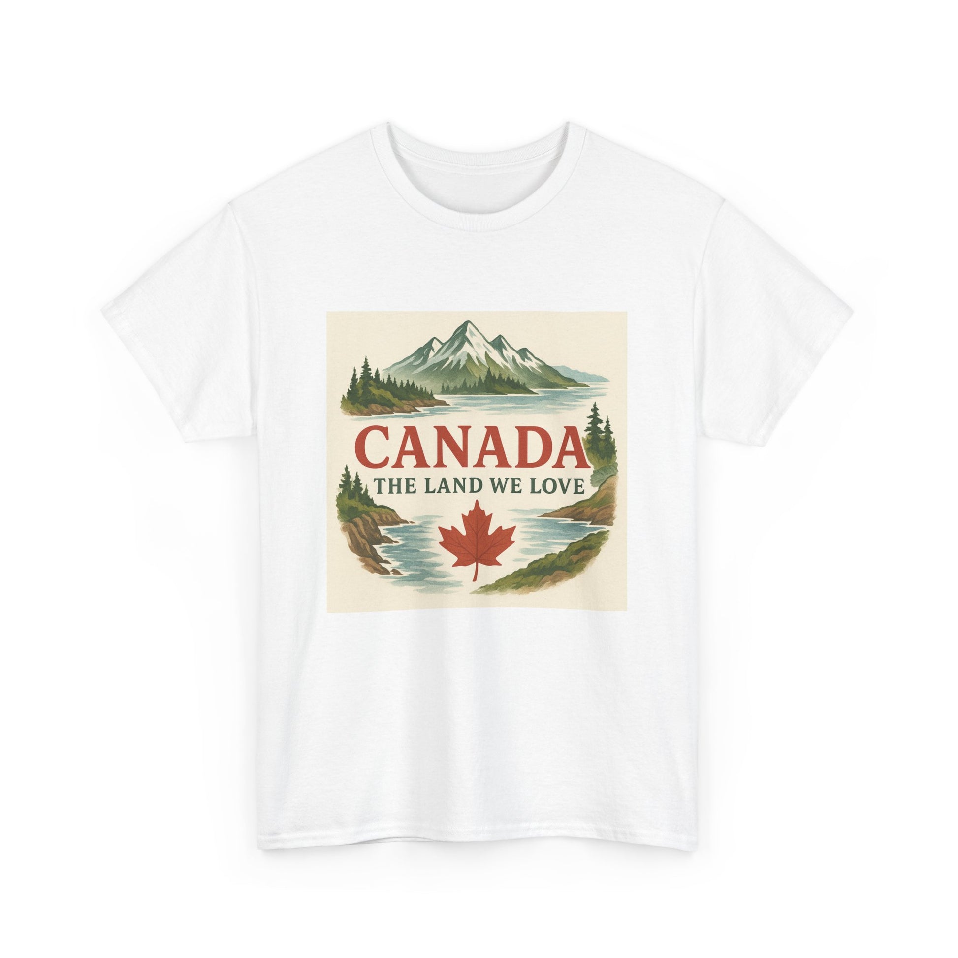 Front: Vintage-inspired illustration of Canada’s majestic landscape — mountains, forests, ocean — with bold CANADA: THE LAND WE LOVE lettering.Back: From Coast To Coast To Coast — with our signature maple heart and website.