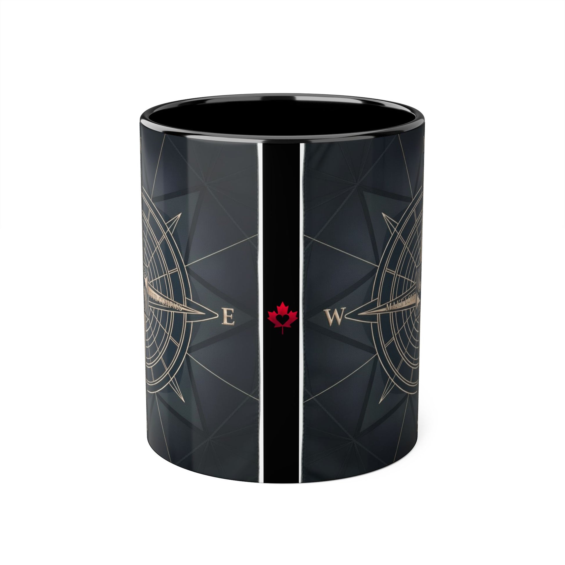 This mug is a daily reminder to let love guide your journey. The Navigate Love Compass Mug features an elegant vintage compass rose design in luxurious champagne gold, with "MAKE LOVE" and "YOUR COMPASS" inscribed on the compass blades, set against a sophisticated dark navy and charcoal background. A distinctive red Canadian maple leaf accent adds a touch of heritage and warmth.